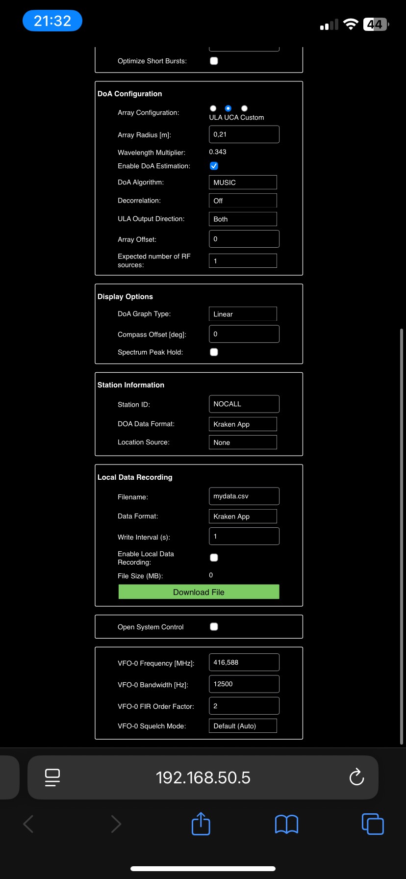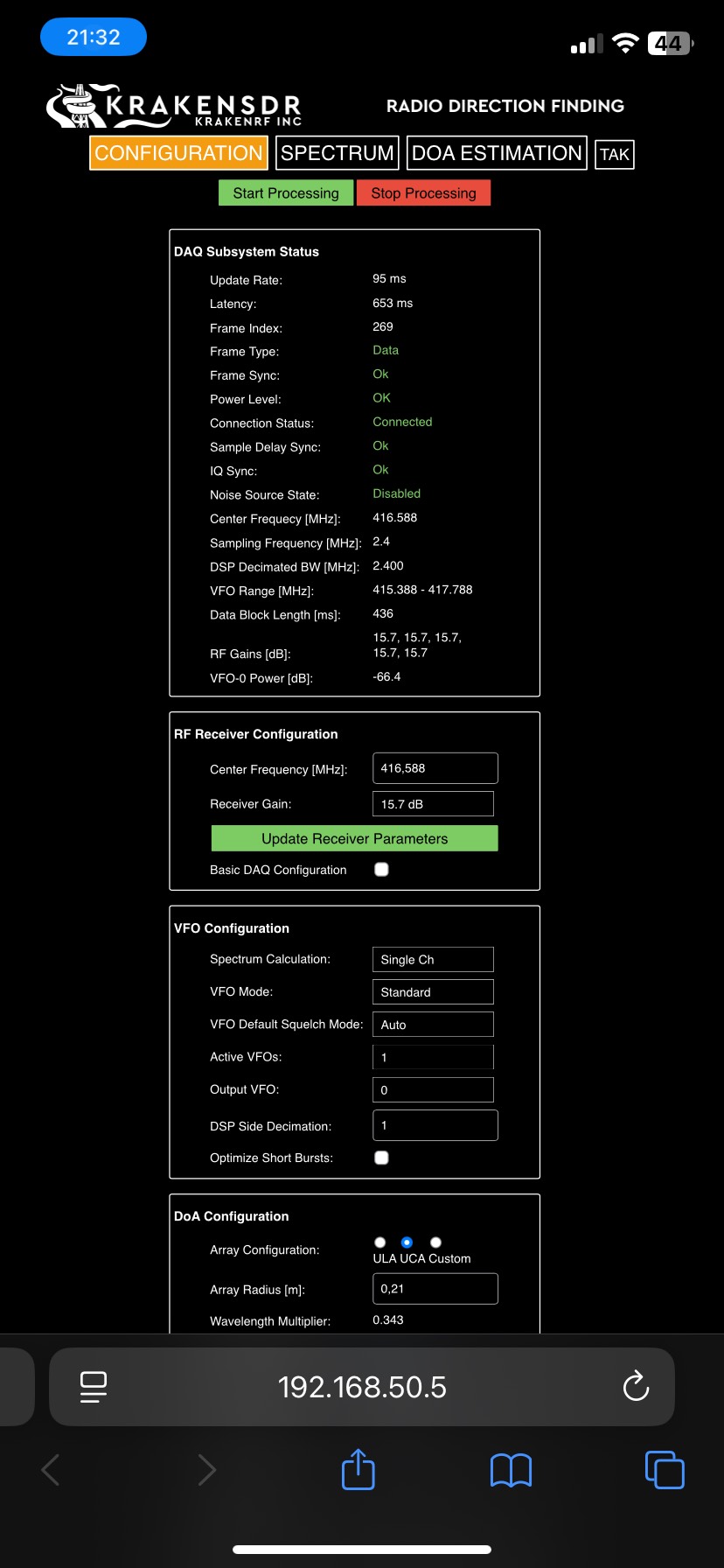 We connected the KrakenSDR and Pi and powered them up. We connected via Wi-Fi and went into server settings. We connected our five antennas. However, when we send a signal, it doesn’t show up at all. We’re sending our signal at 153 MHz, but we’re not getting any response. We initially noticed it was working in the status section, but the map wasn’t. When I pressed Start Processing, everything started showing up as red and empty. Could you help? Thank you.