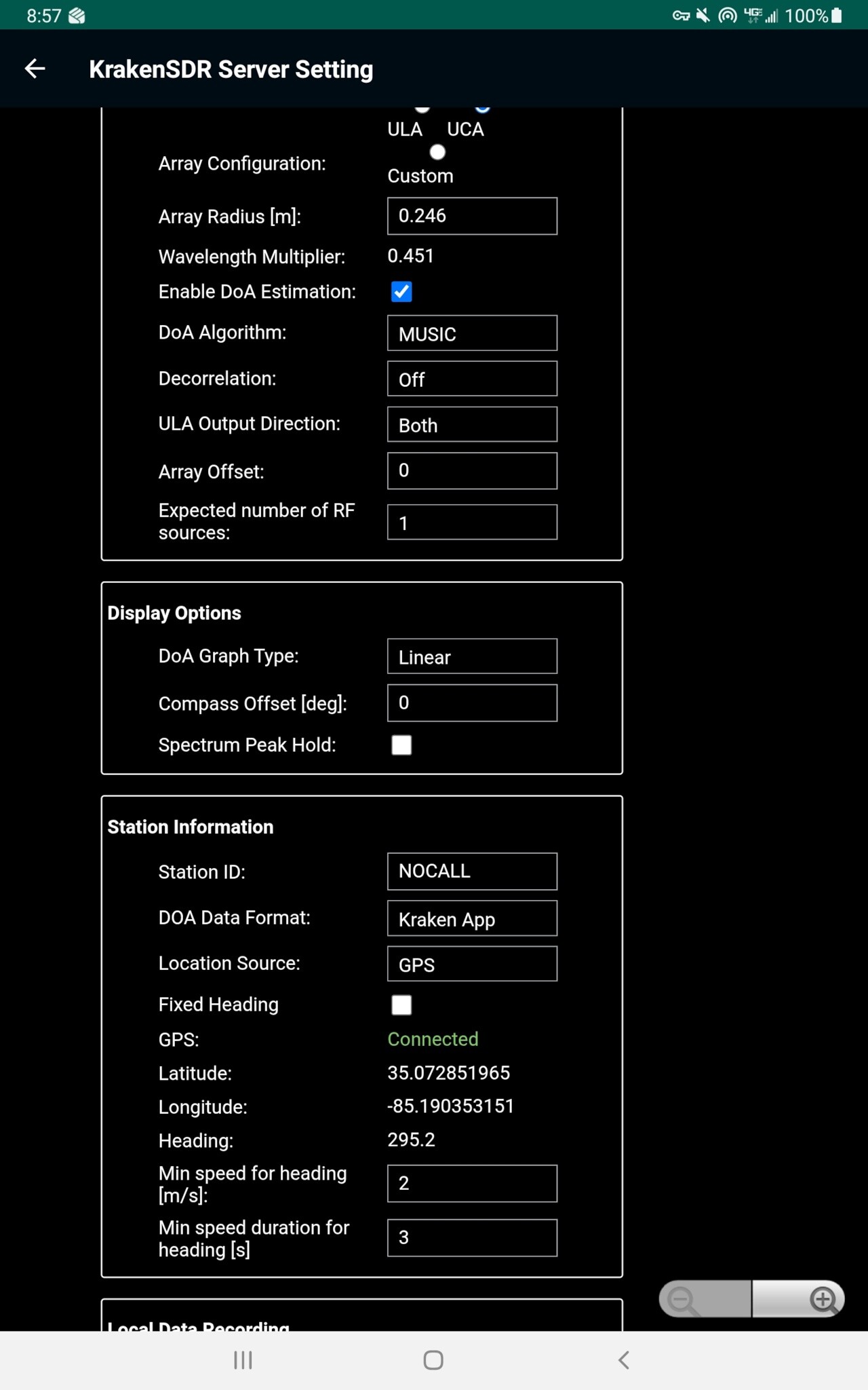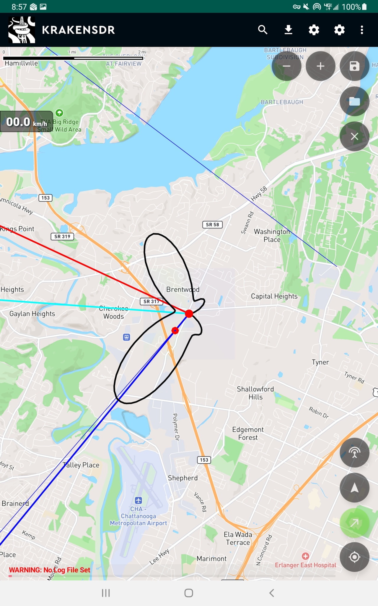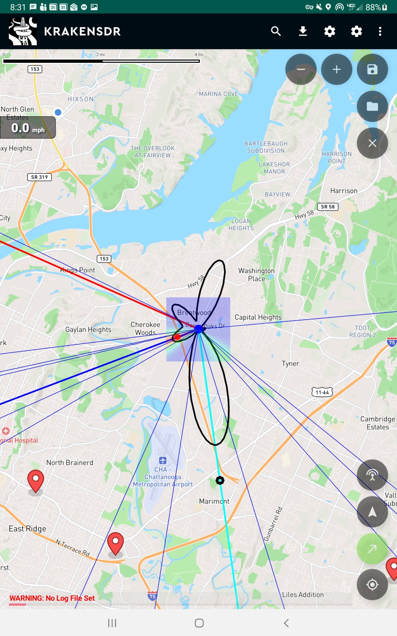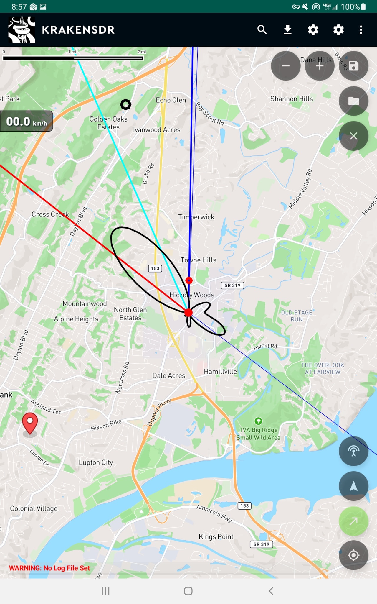 Finally, even using the above settings, if GPS/Location is turned on on my Android tablet, the Kraken app will display that location on the map–see the blue dot by the right corner of the MPH box. With GPS on, the app tracks the location provided by the tablet correctly, but as I drive down the road, it will show one location with the bearing lines and DOA information, and another location of the tablet GPS–it can can accept location data from two different GPS inputs at the same time.