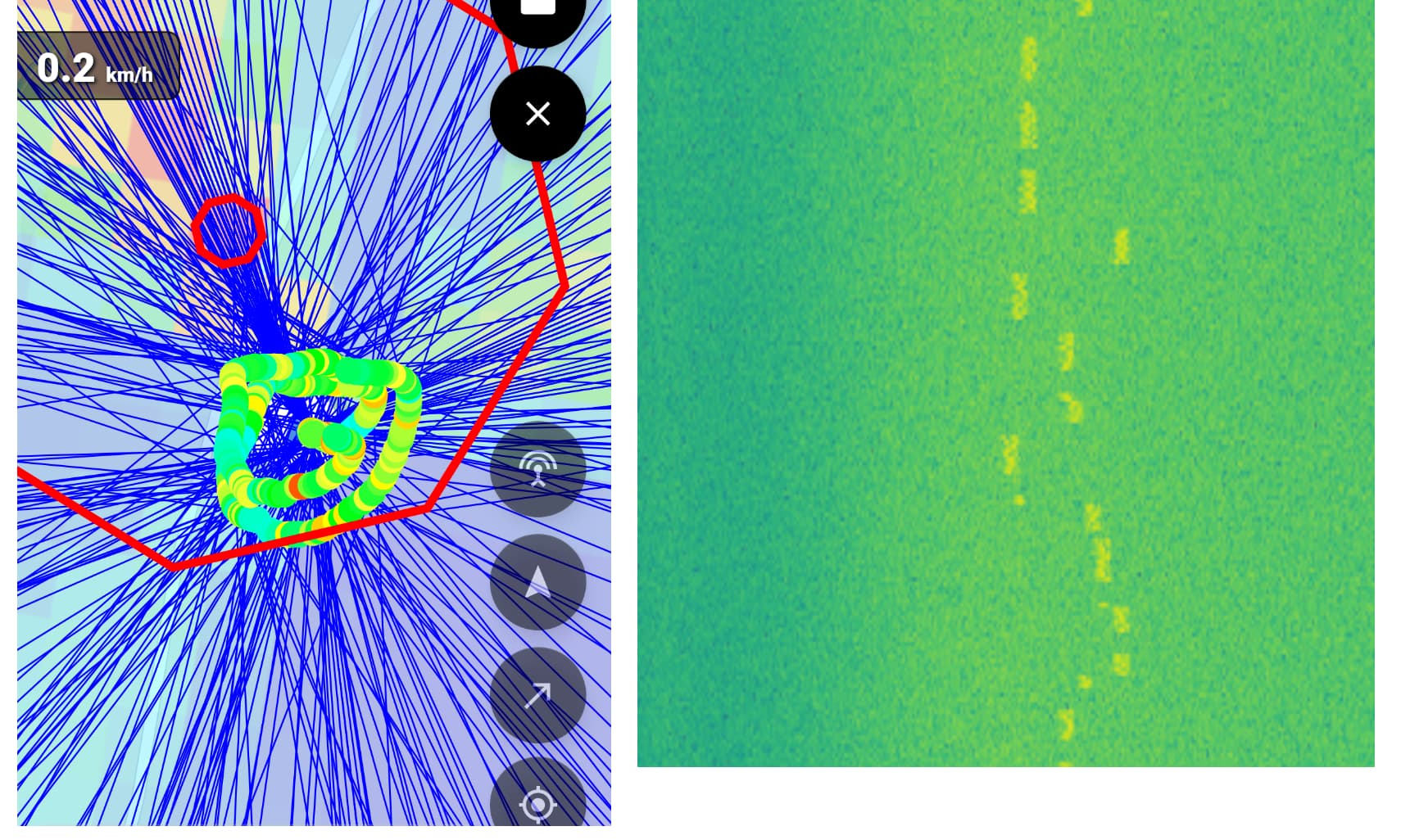 As you can see on the screenshot, it detected the source outside of the path we flew, but actually the transmitter was inside this circle. Also this direction and localization estimate (but more far away) was shown before the flight when the system was just started. The whole output also seems very noisy.